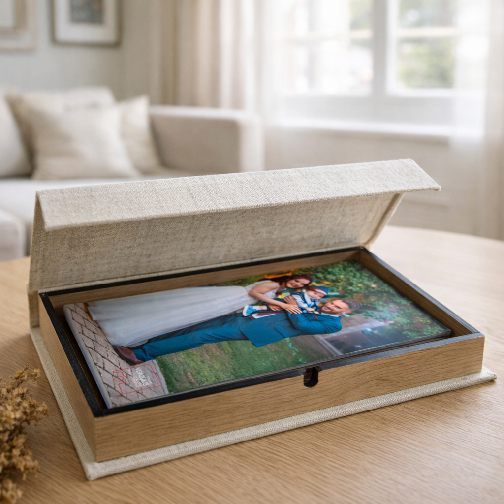 Kουτί συσκευασίας για φωτογραφίες όλων των μεγεθών φτιαγμένο από οποιοδήποτε ύφασμα ή δερματίνη επιθυμείτε.